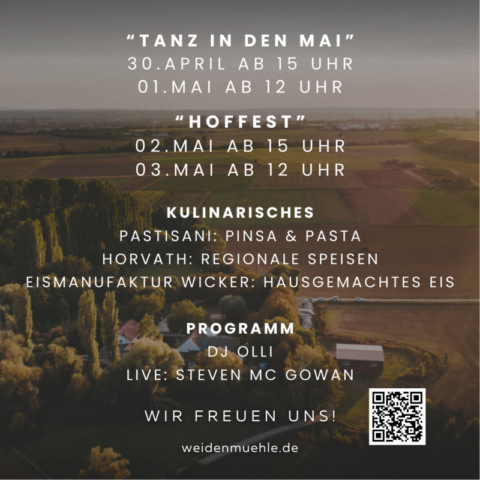 Den Abschluss unseres Hoffestes bildet der 03. Mai ab 12 Uhr. Freut euch auf gesellige Stunden im Hof, leckere Speisen und natürlich unsere Weine aus der Weidenmühle.
