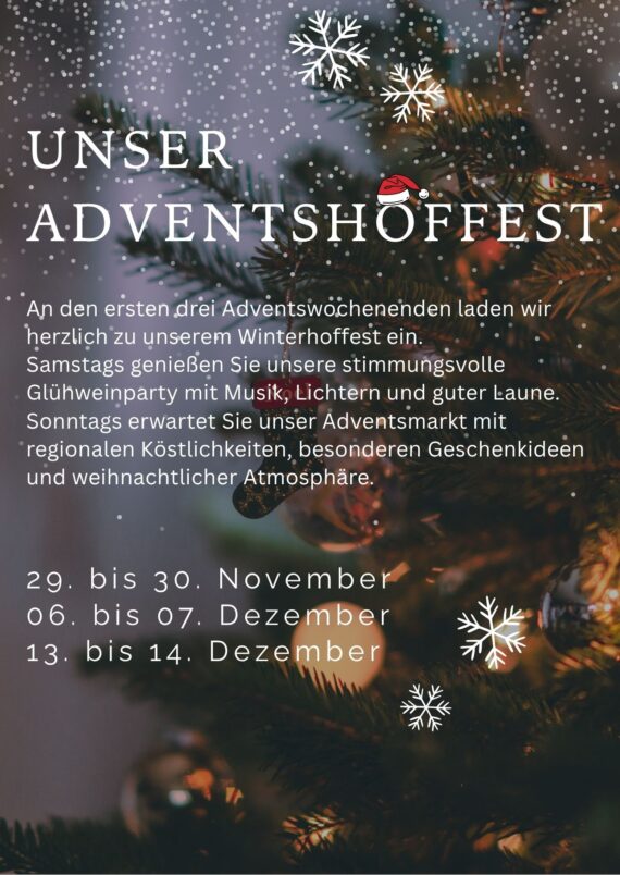 Ende November und im Dezember öffnen wir an drei Wochenenden unsere Türen zum Advents-Hoffest: 29.–30. November, 6.–7. Dezember sowie 13.–14. Dezember. Samstags: Glühweinparty mit DJ. Sonntags: entspanntes, weihnachtliches Beisammensein. Genießen Sie regionale Spezialitäten und unsere Weine und Glühweine in stimmungsvoller Atmosphäre bei uns in der Weidenmühle. Wir freuen uns auf […]