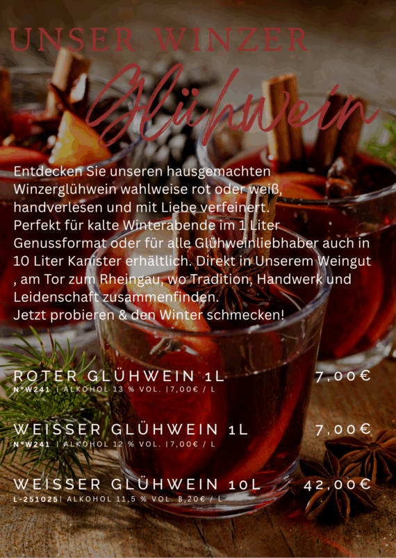 Entdecken Sie unseren hausgemachten Winzerglühwein wahlweise rot oder weiß, handverlesen und mit Liebe verfeinert. Perfekt für kalte Winterabende im 1 Liter Genussformat oder für alle Glühweinliebhaber auch in 10 Liter Kanister erhältlich. Direkt in Unserem Weingut , am Tor zum Rheingau, wo Tradition, Handwerk und Leidenschaft zusammenfinden. Jetzt probieren & […]